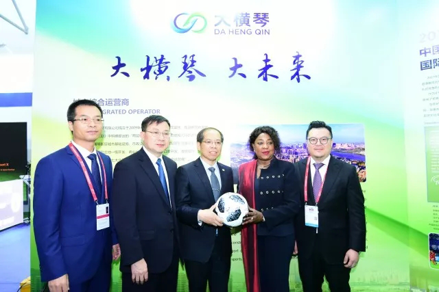 (圖:中國足協(xié)常務(wù)副主席兼秘書長張劍(中),國際足聯(lián)秘書長法瑪特(右2),市委常委郭才武(左2)親臨大橫琴展臺視察指導(dǎo)。)