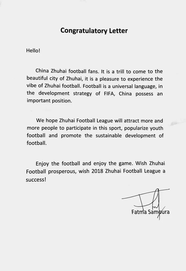 2018珠海市足球聯(lián)賽得到了各方面的關(guān)心和支持,包括國際足聯(lián)秘書長法特瑪·薩姆拉和Soccerex主席托尼·馬丁等國際足壇巨擘,親自為珠海市足球聯(lián)賽發(fā)來了賀信。