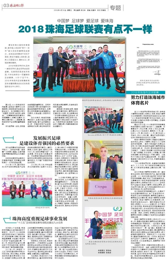 2018年是世界杯年,四年一度的世界杯,是全世界球迷的盛宴。在美麗的海濱城市珠海,今年也將舉辦一項(xiàng)重磅的足球賽事。4月17日下午,由珠海大橫琴投資有限公司策劃、支持,珠海大橫琴文化傳媒有限公司和珠海市體育總會主辦的“2018珠海市足球聯(lián)賽”昨天正式啟動,希望以此推動珠海市足球事業(yè)發(fā)展,打造珠海足球城市品牌。soccerex主席托尼·馬丁,阿根廷前國家隊(duì)隊(duì)員、傳奇球星克雷斯波,廣東省足球協(xié)會副主席、廣東足球運(yùn)動中心主任程志文,廣東省政協(xié)委員、澳門中華總商會青年委員會主任馬志達(dá),珠海市文化體育旅游局副局長鄔向明等出席了發(fā)布會并共同見證了聯(lián)賽啟動。