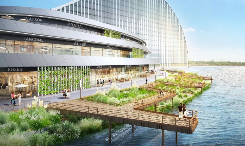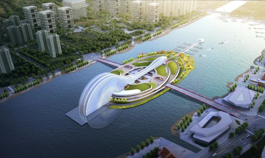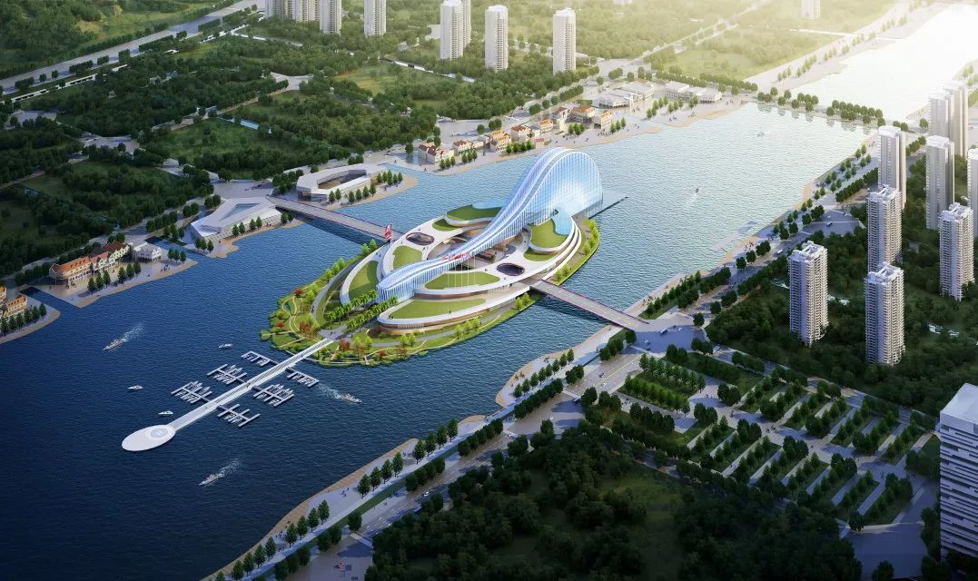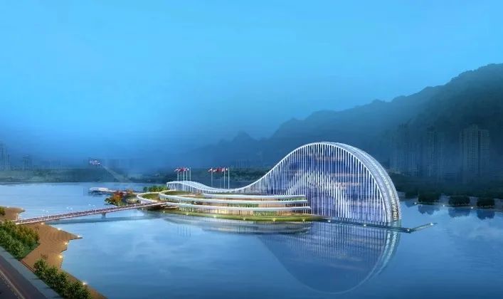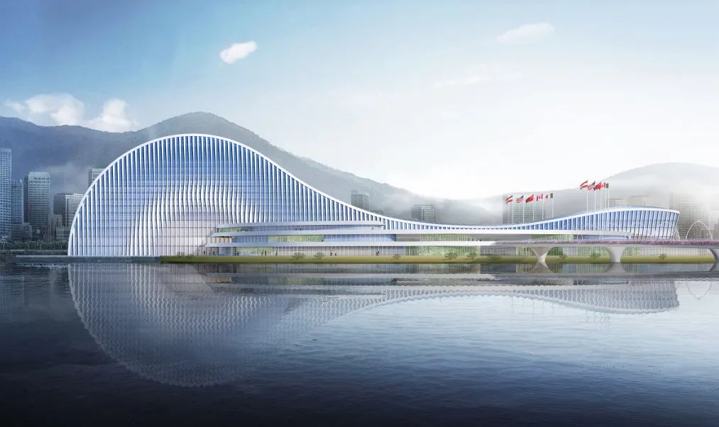 項(xiàng)目建筑設(shè)計(jì)以“映·韻”為設(shè)計(jì)理念,從橫琴地名中獲得創(chuàng)作源泉,汲取琵琶、古琴元素之靈感,將古琴的基本曲率抽象取形,形成建筑基本的曲線形體。從效果圖上看,橫琴天沐琴臺外觀建筑似一把橫臥天沐河上的琵琶,在設(shè)計(jì)上采用了大跨度的超高空間、連續(xù)鋼架屋頂結(jié)構(gòu)以及巨大玻璃幕墻,以打造靈動(dòng)的建筑曲線,形成連續(xù)開放的室外公共空間和活力街區(qū)。