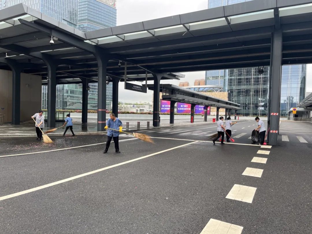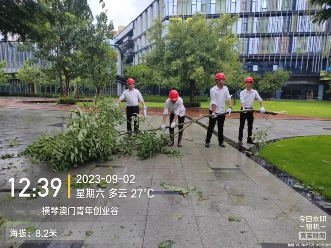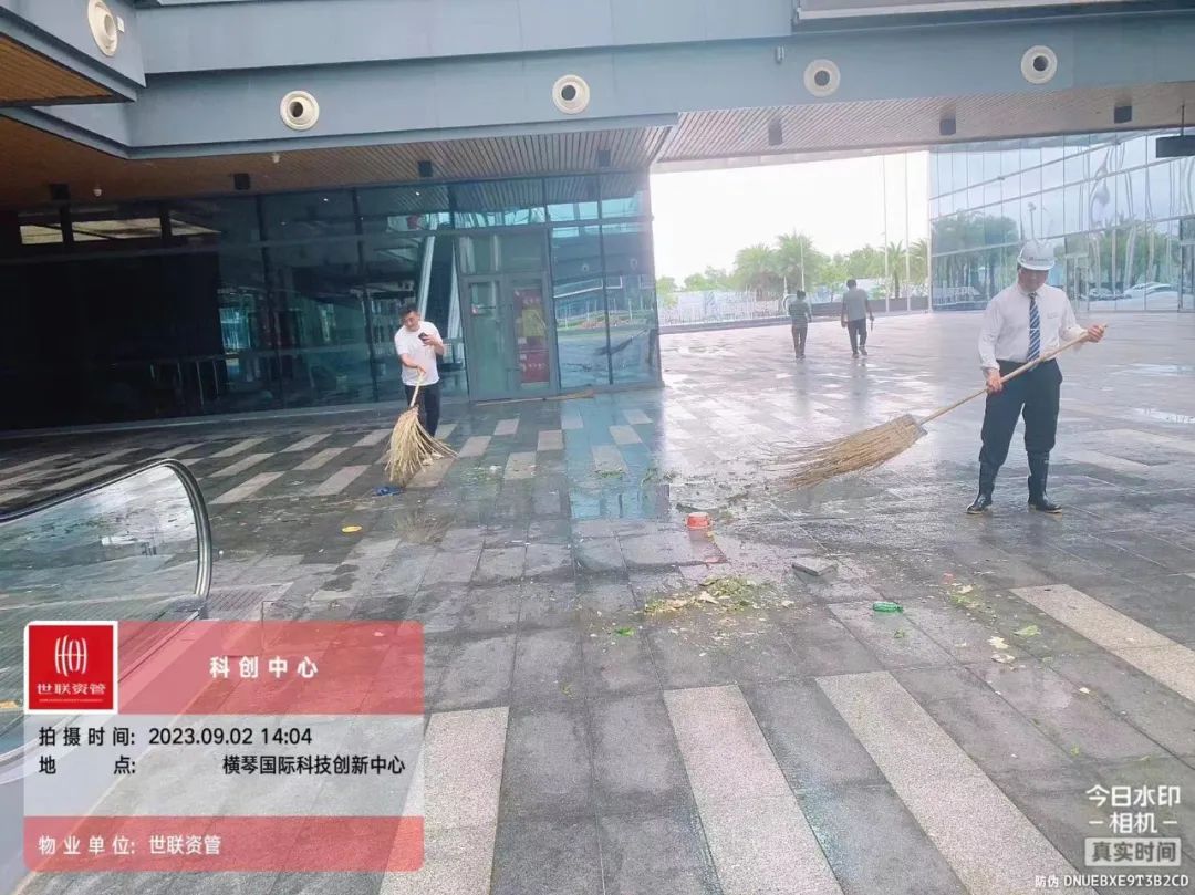 第一時間對園區(qū)環(huán)境進行清障復(fù)原,完成園區(qū)所有枯樹樹葉清理、樹木扶正,樹撐檢查加固;完成園區(qū)公共垃圾桶、煙灰柱、地毯復(fù)原工作;檢查受災(zāi)情況并進行修復(fù),檢查設(shè)備機房、電梯是否正常運行等,確保企業(yè)可正常辦公。其中橫琴國際科創(chuàng)中心園區(qū)應(yīng)急避難場所本次接待人員約1500人次,產(chǎn)生生活垃圾約3噸,人員撤離后已及時清理。