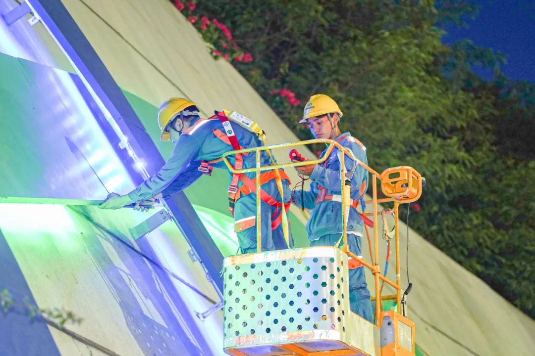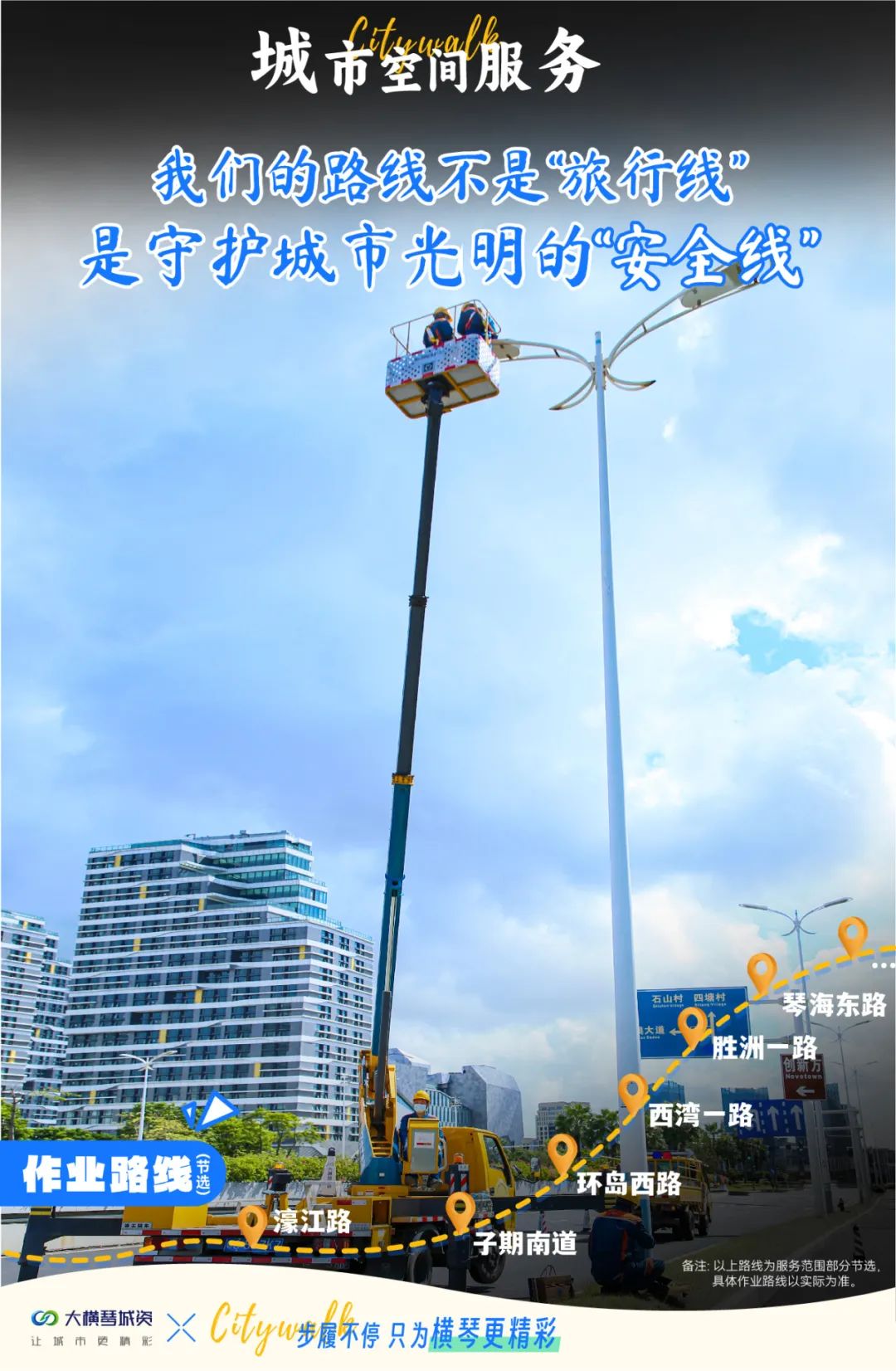 每當(dāng)夜幕降臨,一盞盞明亮的路燈、一處處別致的亮化景觀(guān),勾勒出了合作區(qū)秀美的輪廓,市民游客在城市街頭Citywalk,他們則在城市高空,2萬(wàn)余盞路燈、2萬(wàn)多盞景觀(guān)燈,碼頭、立交、橋梁等景觀(guān)亮化燈光......都有他們的空中身影,陽(yáng)光直射之下,腳站高空檢修,暴雨臺(tái)風(fēng)過(guò)后,更是以最快速度搶修,他們熟悉橫琴每一盞燈的“脾性”,他們默默守護(hù)著城市每個(gè)角落的光明。