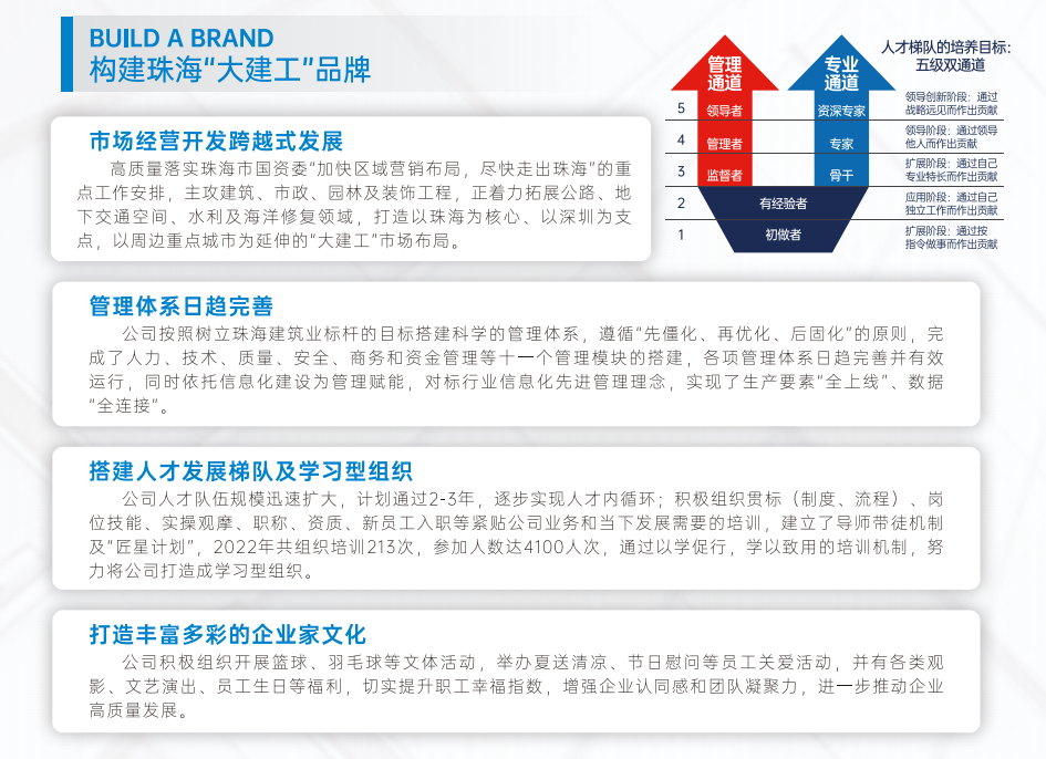 珠海建工集團自正式運營以來,通過短短兩年時間的精心謀劃、積極應(yīng)對、主動作為,業(yè)務(wù)承攬量實現(xiàn)了從拾億級到百億級的突破,主要經(jīng)營業(yè)績實現(xiàn)了質(zhì)的提升,資產(chǎn)規(guī)模和人才隊伍也呈十倍級地迅速壯大,更榮獲了“AAA信用企業(yè)”、“高新技術(shù)企業(yè)”等一項項殊榮。也在高質(zhì)量發(fā)展的征程中,錘煉鍛造了一支堪當重任的干部隊伍。