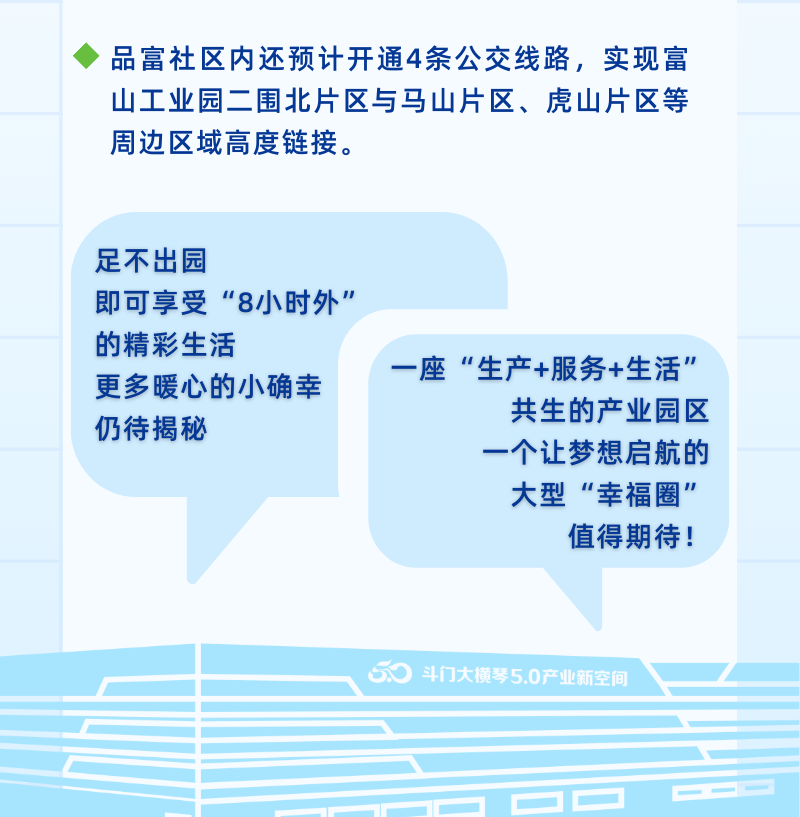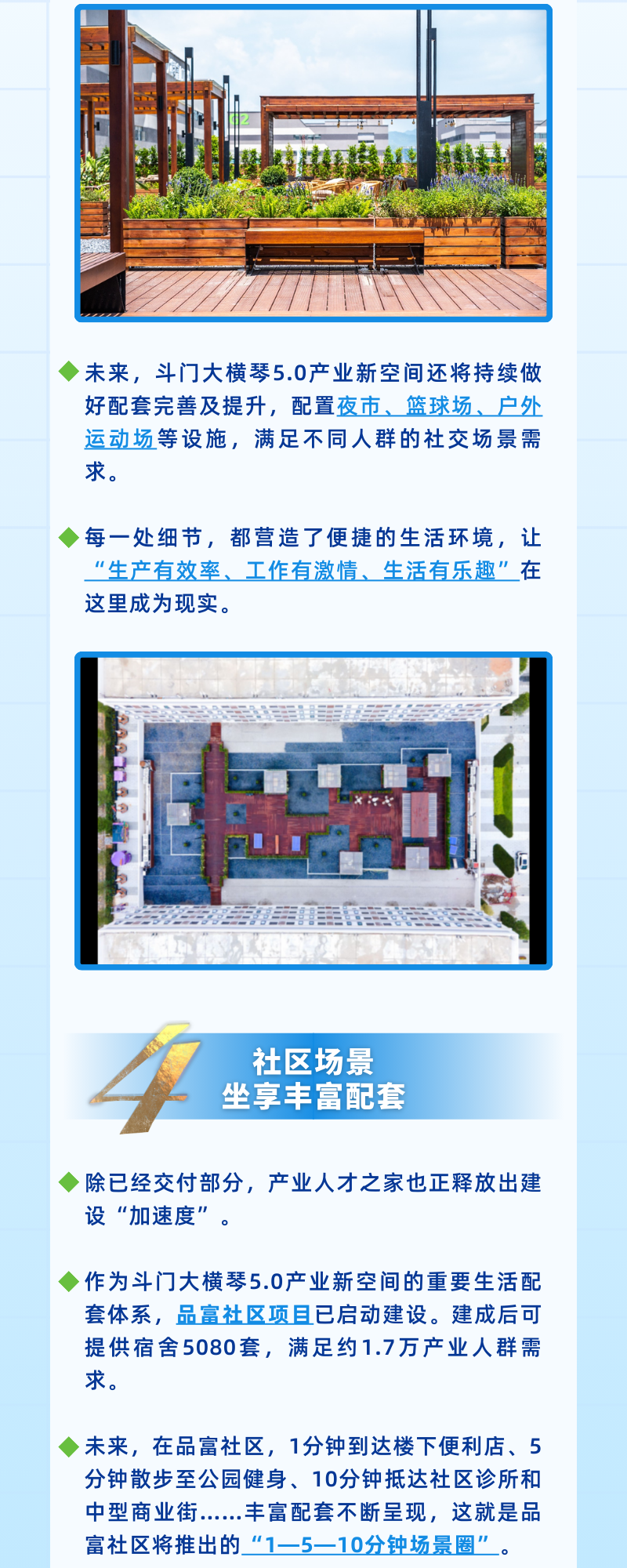 新空間,托起產(chǎn)業(yè)新夢(mèng)想。作為一座能“拎機(jī)投產(chǎn)”“拎包入住”的高質(zhì)量園區(qū),斗門大橫琴5.0產(chǎn)業(yè)新空間不僅適應(yīng)新形勢、賦能新技術(shù)、承載新產(chǎn)業(yè),還配備能滿足員工吃、住、娛樂休閑等需求的生活、商業(yè)配套。