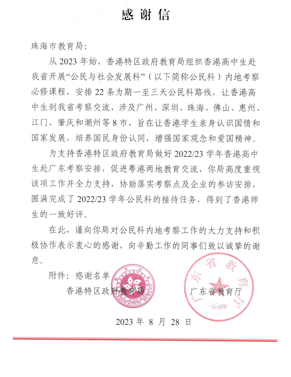 助力粵港教育交流,支持兩地智趣研學(xué)。香港特區(qū)政府教育局組織香港高中生赴我省開展“公民與社會發(fā)展科”內(nèi)地考察必修課程,大橫琴管廊積極配合相關(guān)工作的開展,為香港高中生細致介紹橫琴綜合管廊這一保障城市運行的“地下生命線”,獲“香港特區(qū)政府教育局、廣東省教育廳”致信感謝,被認定為“工作特別突出單位”。