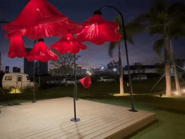 夜晚,當(dāng)游人經(jīng)過,在喇叭裝置處說出“熱烈慶祝中華人民共和國成立75周年”、“熱烈慶祝澳門回歸祖國25周年”等祝福語時(shí),花朵會(huì)自動(dòng)打開并亮燈,創(chuàng)造出驚喜的互動(dòng)體驗(yàn)。